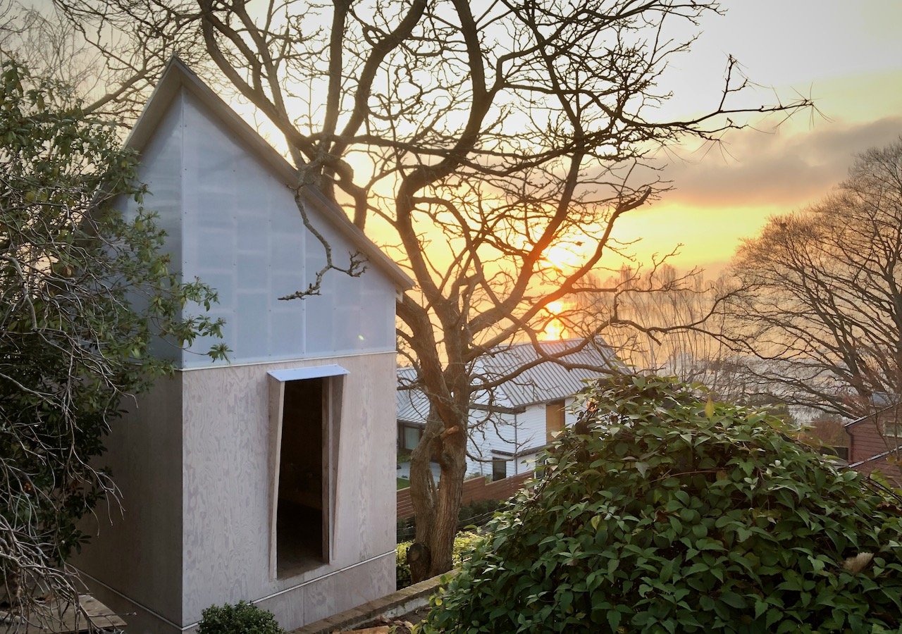 This project developed after an invitation to client Mattie’s recently renovated 100-year-old home. Outside the stunning house, Mattie envisioned a modern playhouse for her two daughters, a structure that would take inspiration from her re-envisioned attic space. Mattie entrusted us with a small, paper model she had made, which we adapted into a design that featured the palette and materials found in her inspired attic: white-washed plywood, exposed LVL framing, and frosted polycarbonate panels.