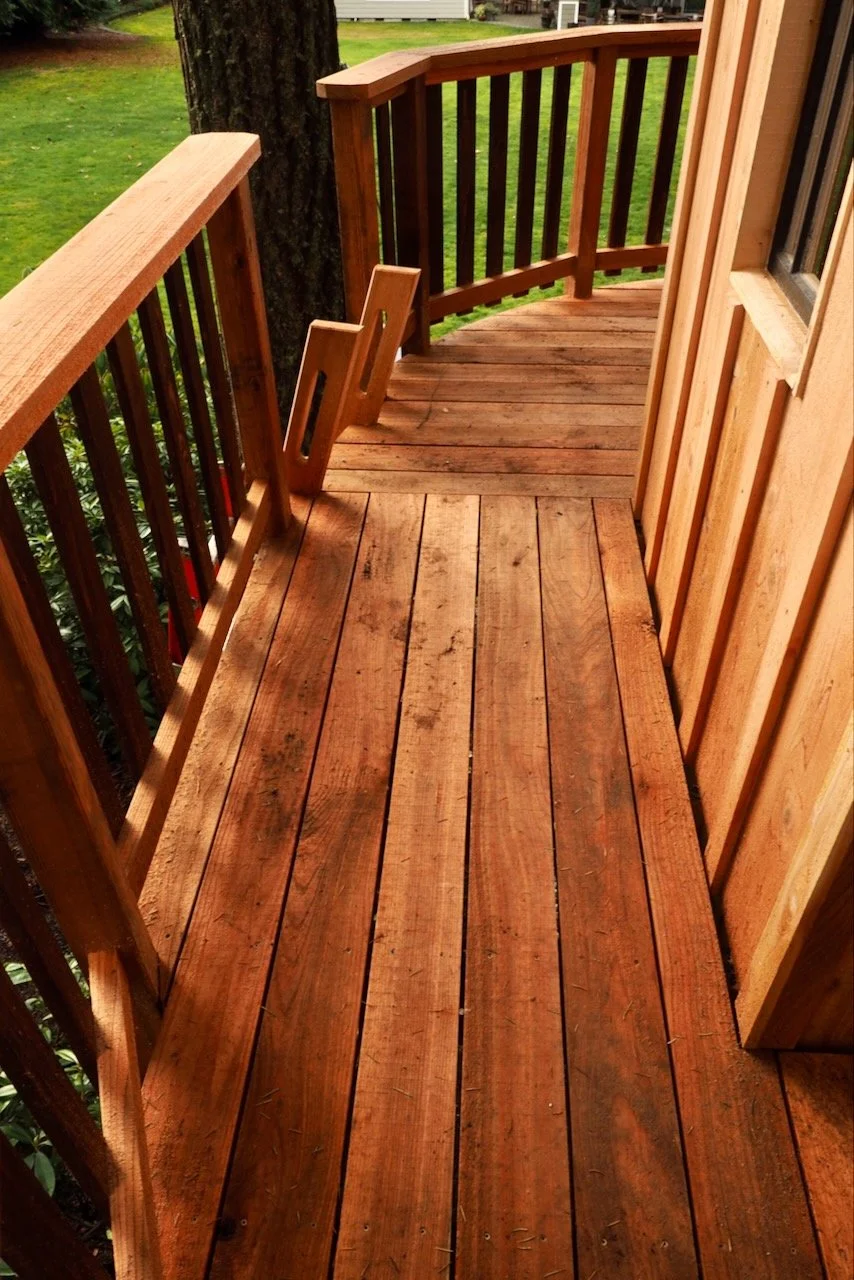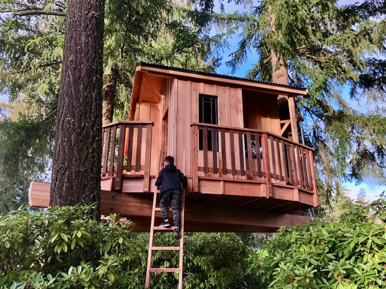 With the surrounding trees dictating the footprint and orientation, the floor plan developed naturally. The structure needed to fit comfortably within the canopy while still allowing room for movement and play. From there, the saltbox roofline emerged — a form that gives the treehouse a distinctive profile while serving practical purposes. The higher interior ceiling creates a more open feel inside, and the extended roofline provides a covered deck area, adding usable outdoor space in varying weather.
