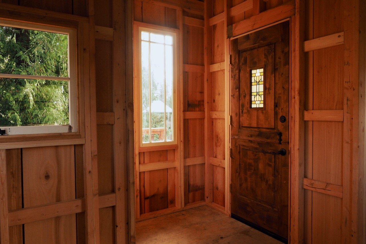 Material choices further defined the character of the build. Reclaimed windows and doors were incorporated to bring warmth and personality, pairing well with cedar board-and-batten siding. The board and batten not only completes the exterior with a clean, timeless look, but also carries through to the interior for a cohesive finish. It’s a straightforward material approach that balances durability, aesthetics, and cost efficiency.