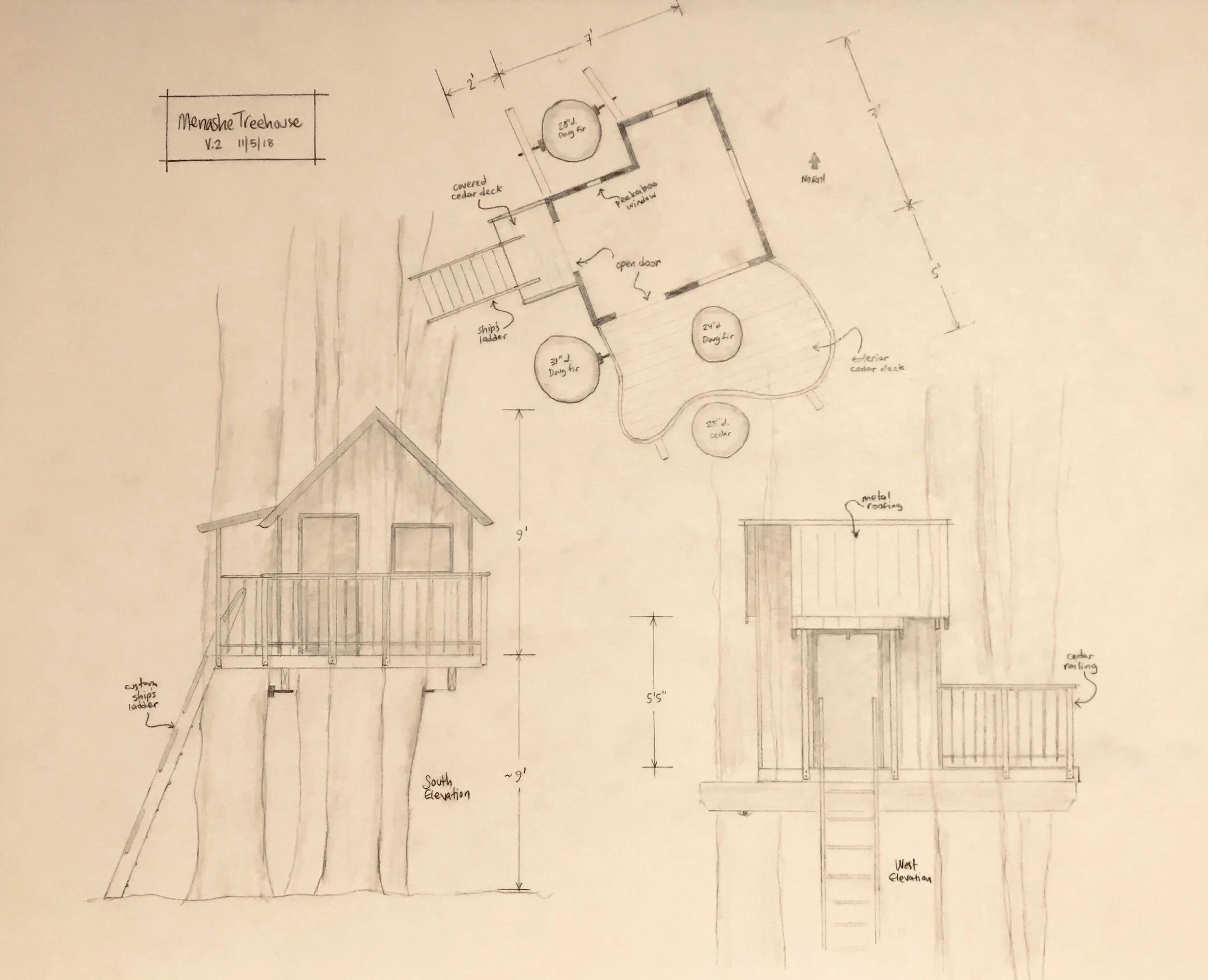 David took notes describing all their wishes and went home to design the structure. David took into consideration the client’s small yard as well as neighboring houses and worked to design something both appealing to the eye while also including the details the family hoped for. Unfortunately, the cost for the original design was slightly over the family’s budget, so Sarah and David worked to re-design the treehouse and come up with something that fit both the budget as well as the vision. Thankfully, they arrived at a design everyone was happy with.
