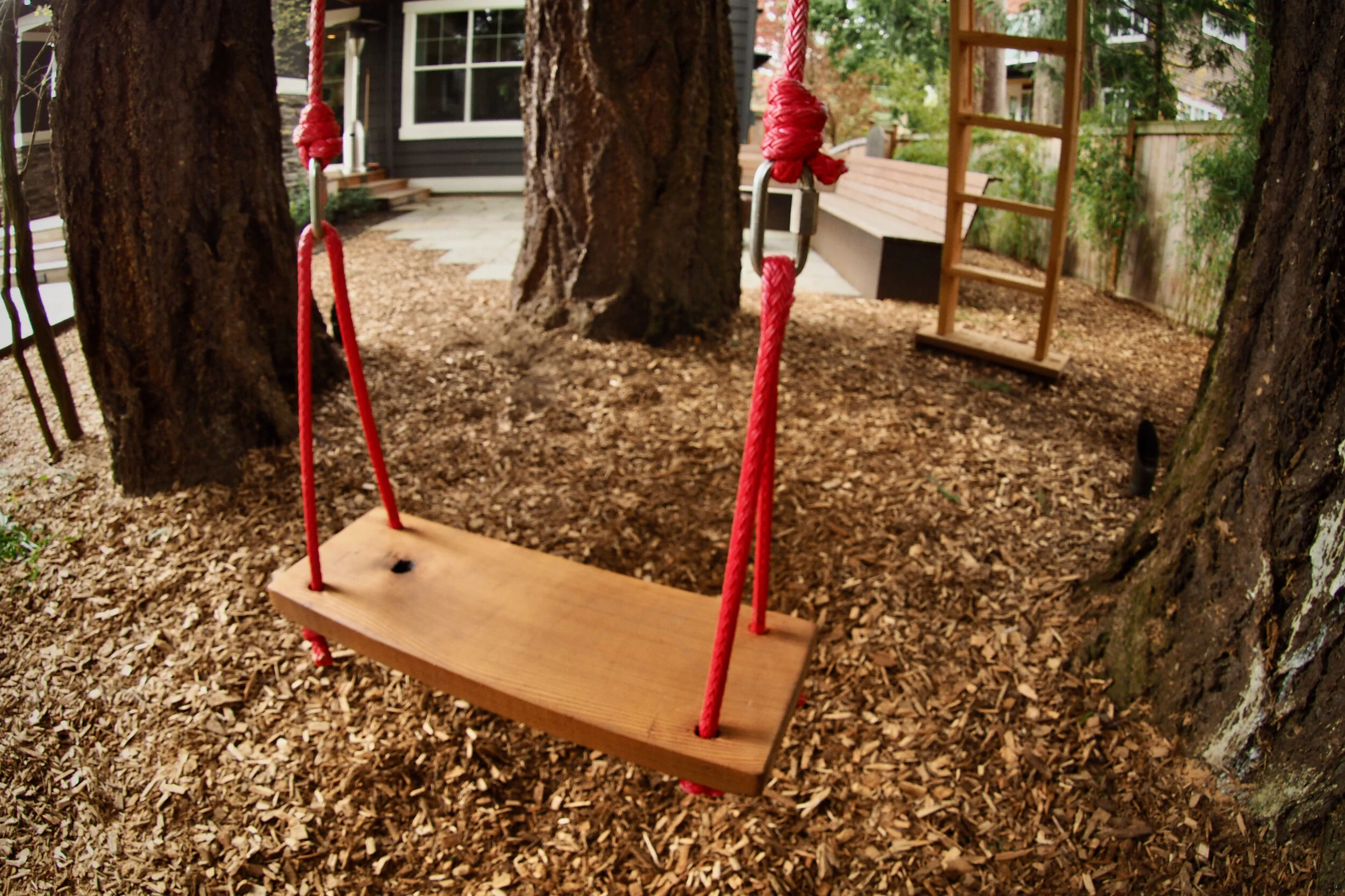 Sarah reached out to David hoping to build a treehouse for her two kids, ages 4 and 7. David met with them at their property and was pleased to discover a small grove of large, healthy trees in the perfect arrangement for a treehouse. The clients described to David what they hoped to build: they wanted a small structure for the kids to play and a swing that would hang under the treehouse.