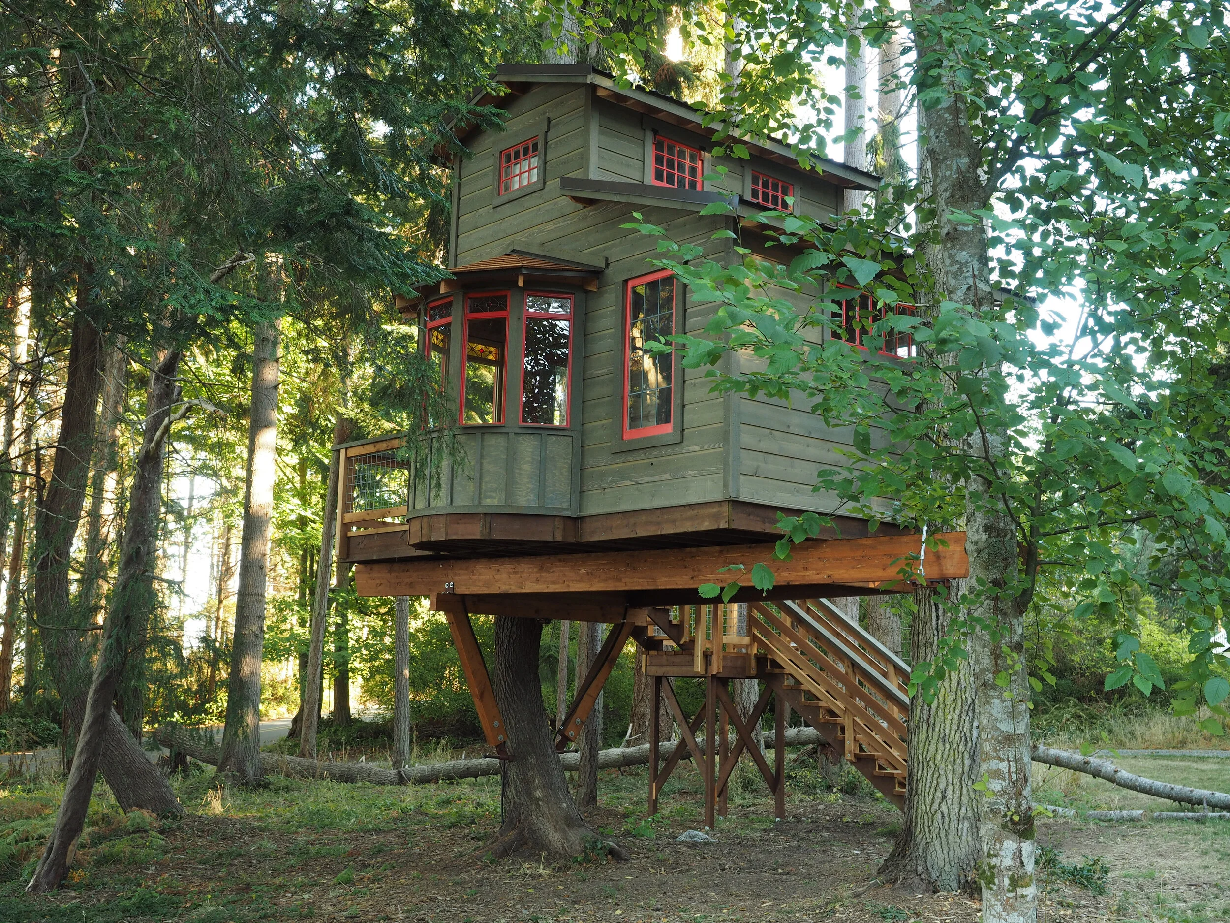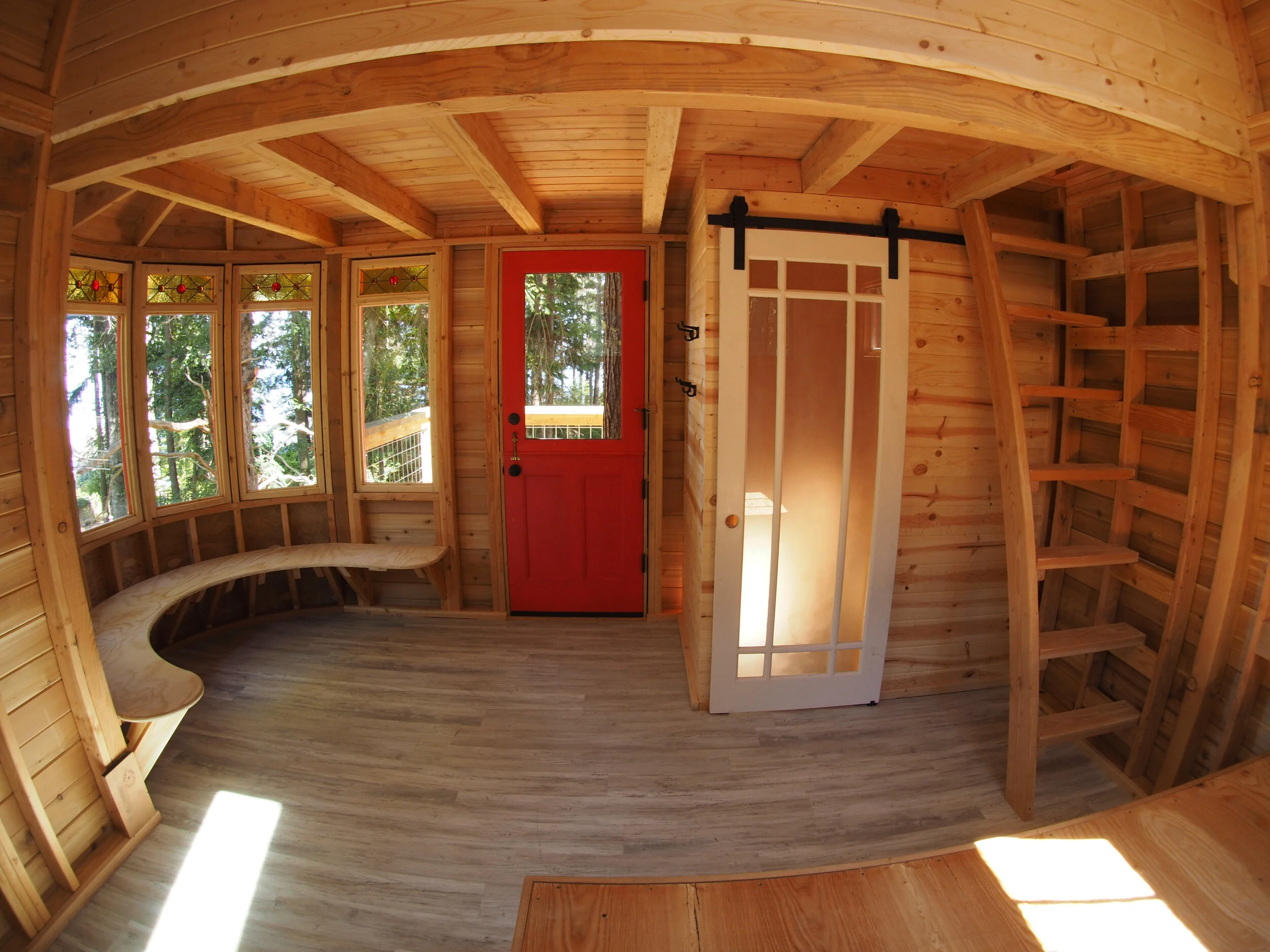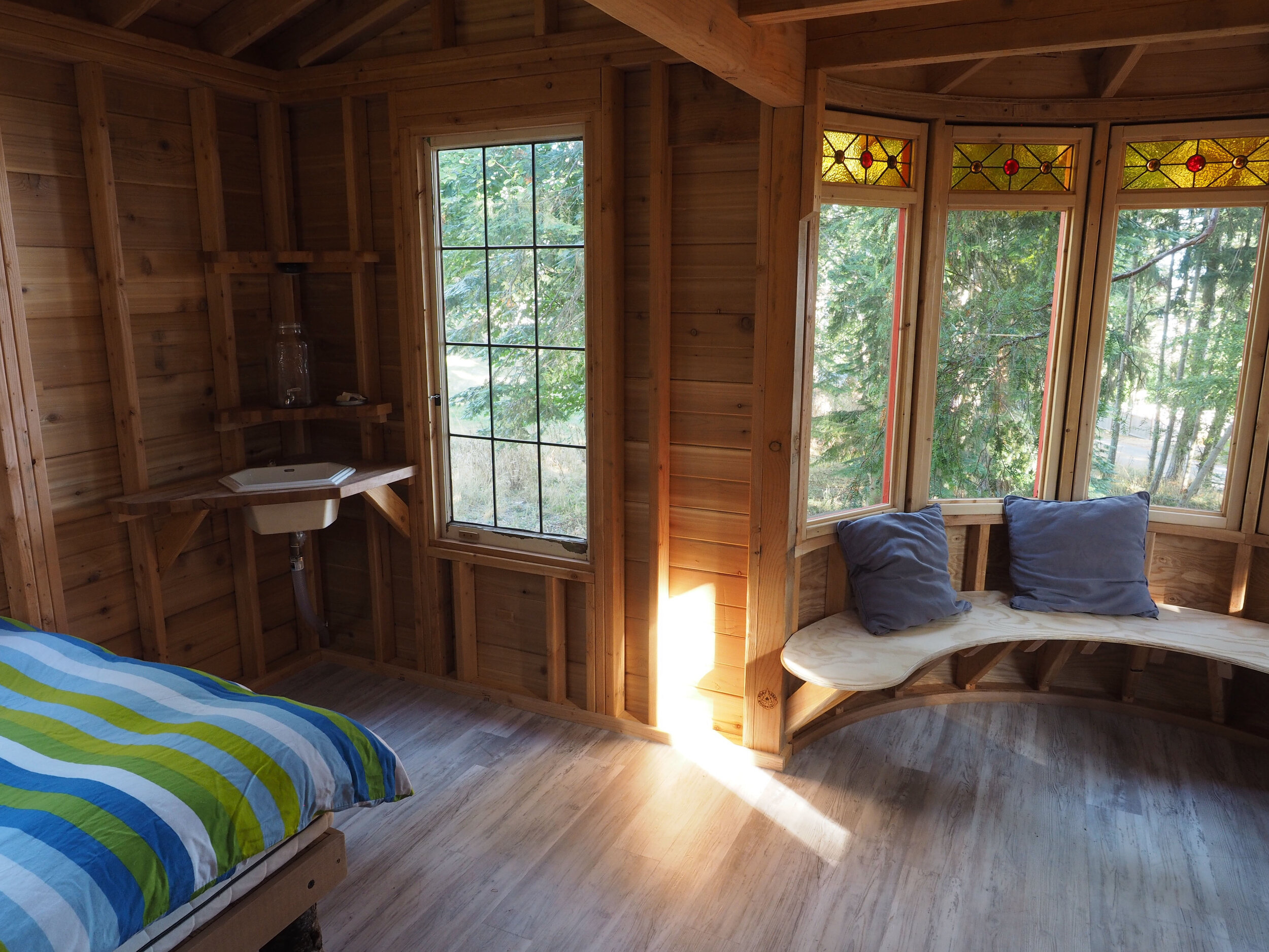 What they came up with was a three-season treehouse with no electricity or insulation — though both can be added later. Everyone’s favorite feature is a bay window that contains a built-in bench and leaded glass windows.